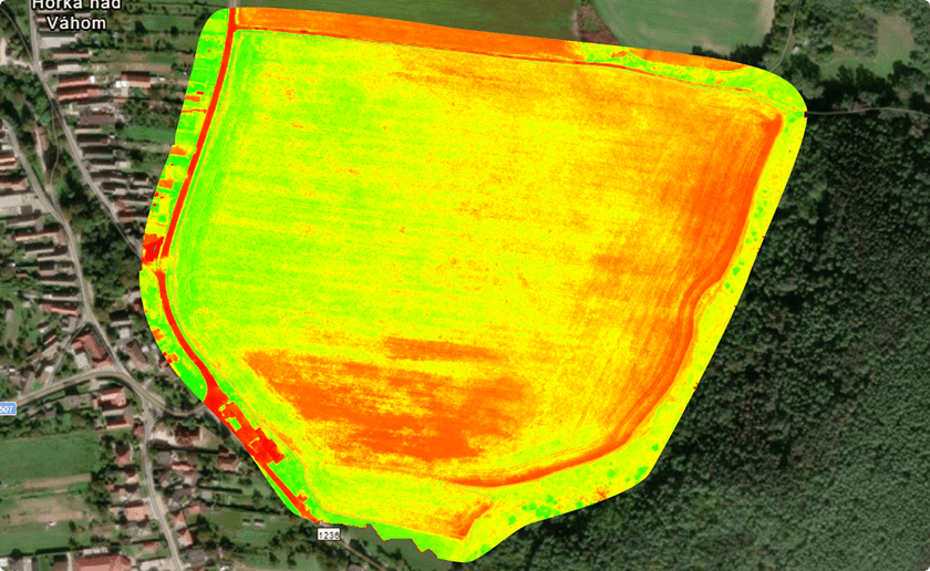 NDVI index zvýrazňuje silnejšie a vitálnejšie časti porastu zelenou farbou, zatiaľ čo slabšie, redšie zóny sú zobrazené červenou.