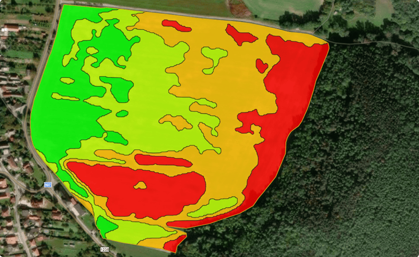 Pole bolo na základe biomasy porastu, podľa NDVI indexu, rozdelené do štyroch zón.